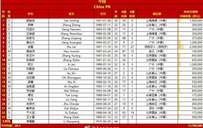 中国队23人完整名单(按号码):1-颜骏凌、2-郑铮、3-邓涵文、4-王燊超、5-张琳芃、6-蒋光太、7-武磊、8-蒿俊闵、9-张玉宁、10-张稀哲、11-阿兰、12-刘殿座、13-徐新、14-池忠国、15-吴曦、16-金敬道、17-韦世豪、18-谭龙、19-刘洋、20-朱辰杰、21-戴伟浚、22-于大宝、23-王大雷